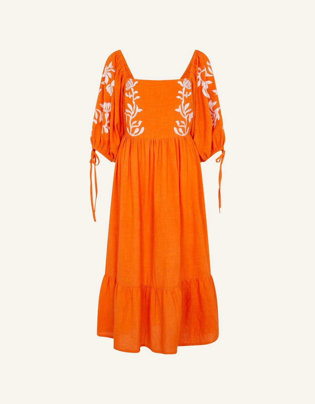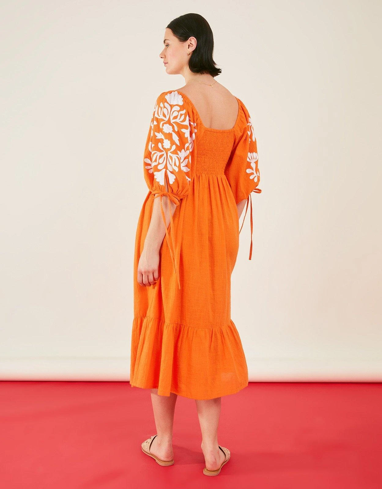 Doused in a clementine hue and ornamental print, this dress is bold and beautiful for days drinking bubbly under the sun. It sits with a square neck and tie puff sleeves through the bodice, with a shirred panel on the reverse for maximum stretch. Falling to midi length, bring attention to the tiered hem with an anklet and flat sandals.