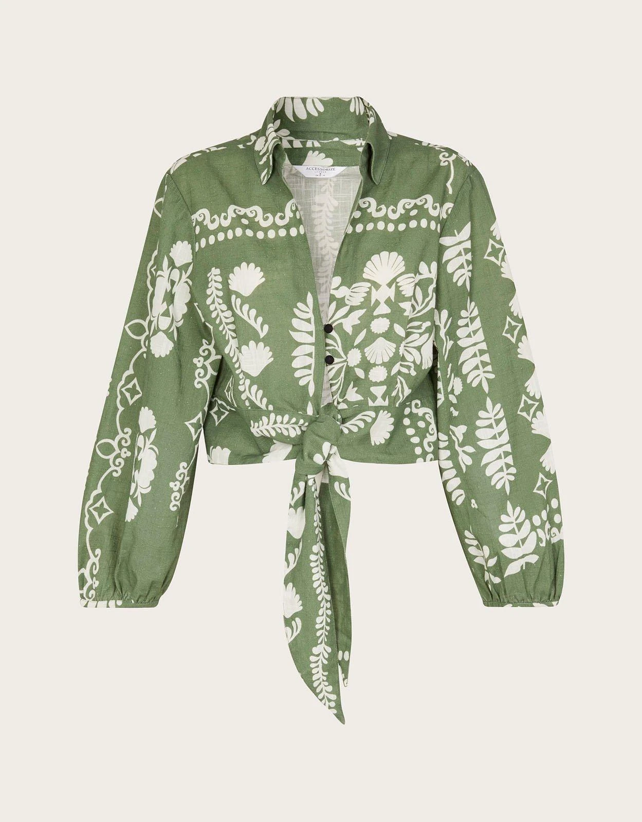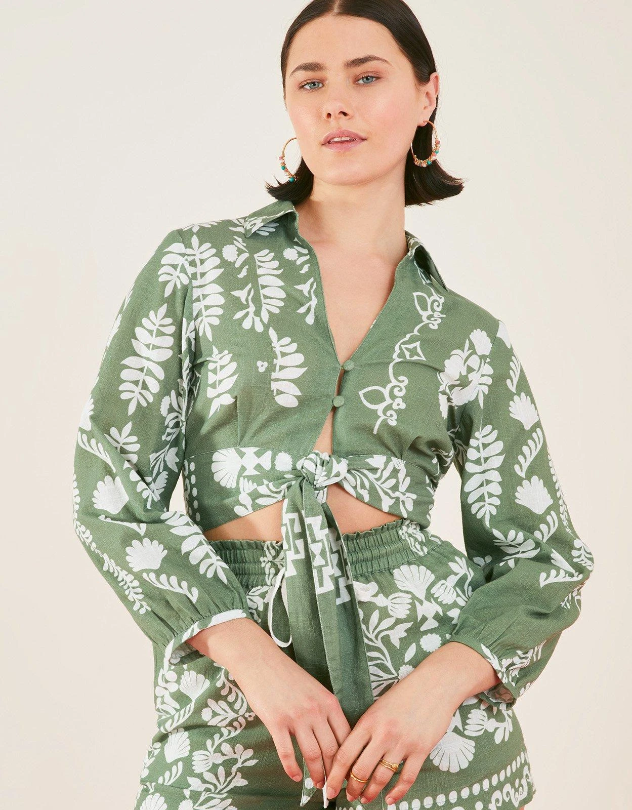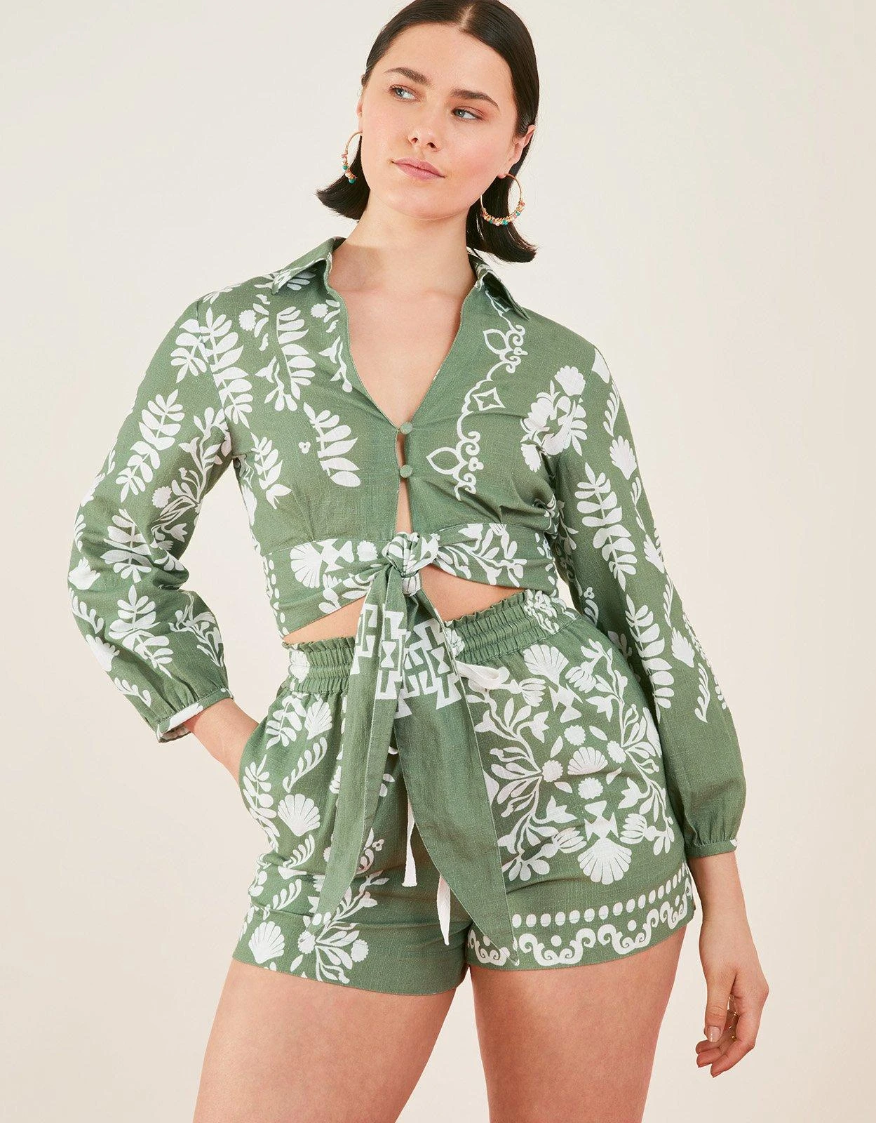 Designed with a chic ornamental print, this shirt is cut with blouson sleeves and a classic structured collar. The mini button through fastening takes you to the cropped tie waist detailing for an easy beachy look.