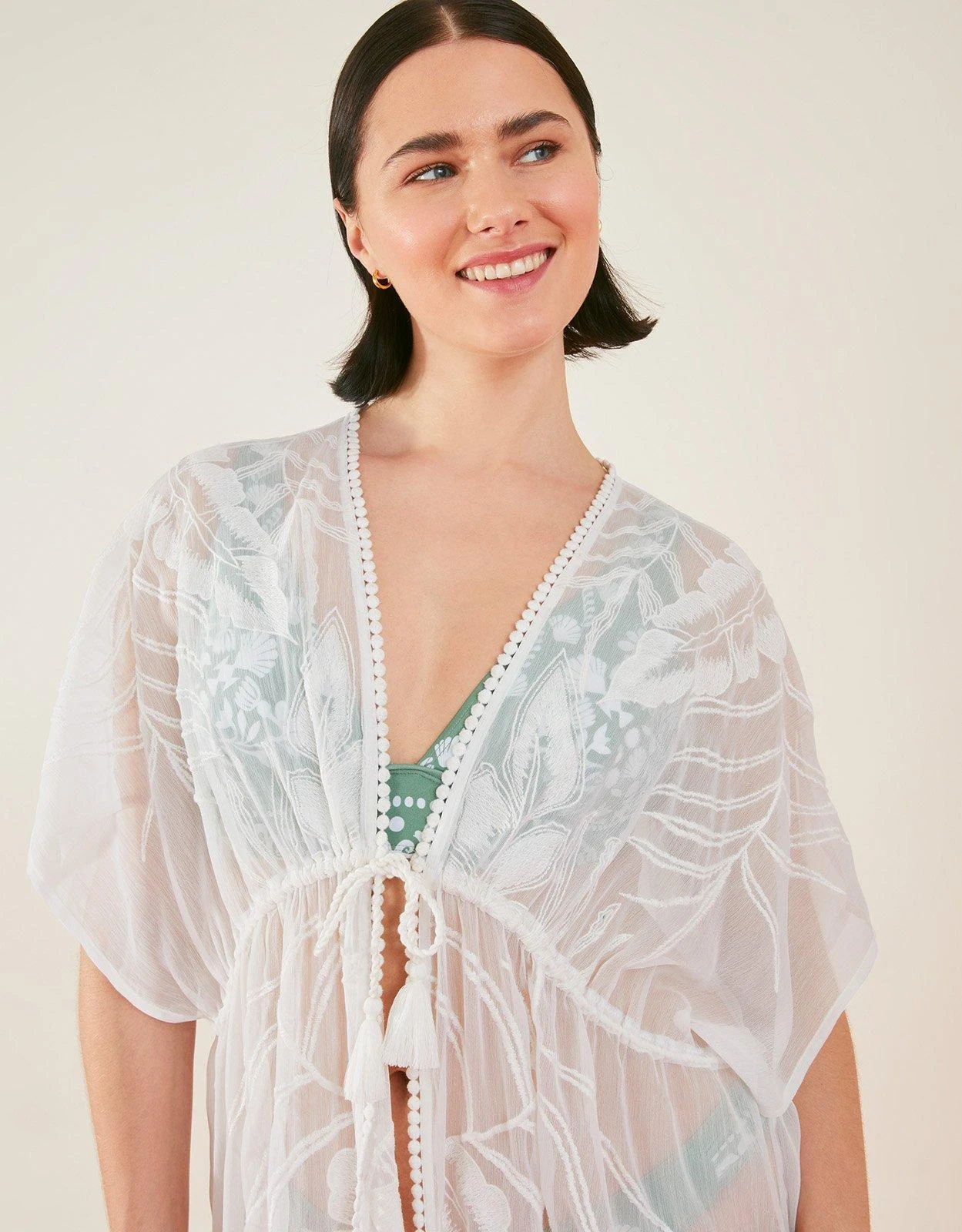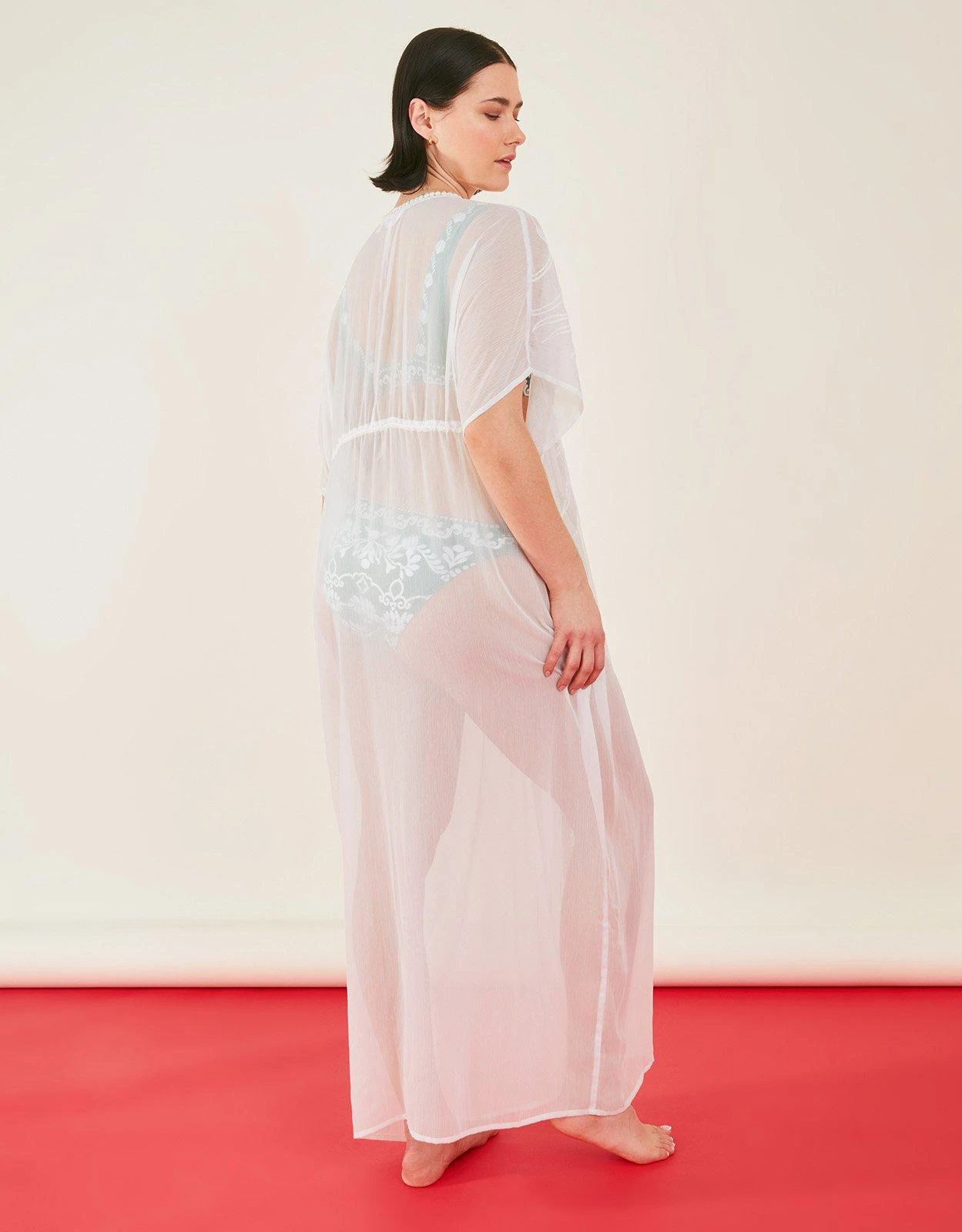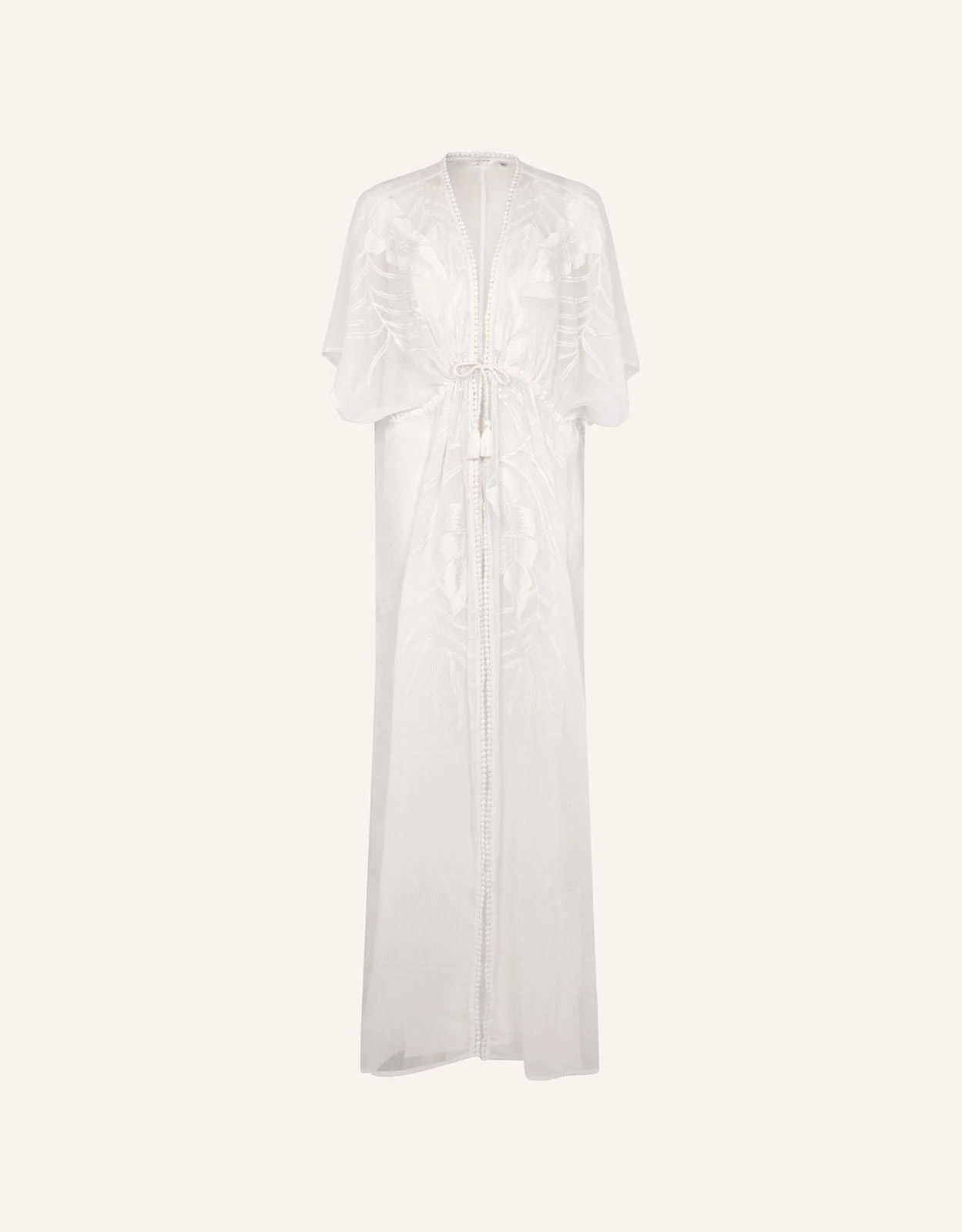 Adding pure glamour to your beachside look, this angelic kimono is boasts a floor length cut, with floral embroidery throughout. Show off your swimwear with the open front, or fasten it with the drawstring, tassel waist for breezy trips to the bar.