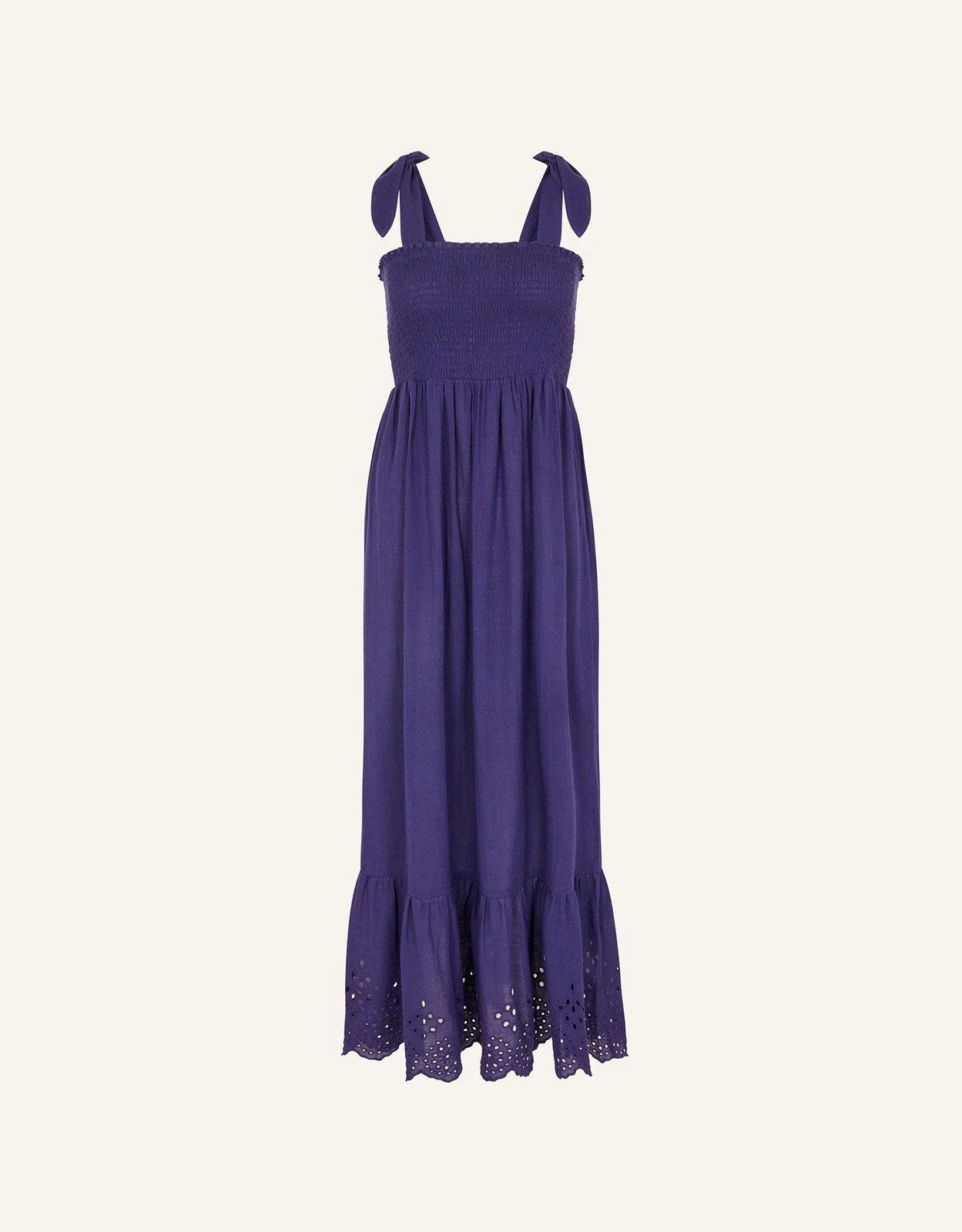 An effortless option for summer mornings, this dress combines a timeless navy blue hue with a swishy maxi profile with pretty broderie detailing. The shirred bodice stretches to fit comfortably around your bust, with a square neck and bow straps to finish.