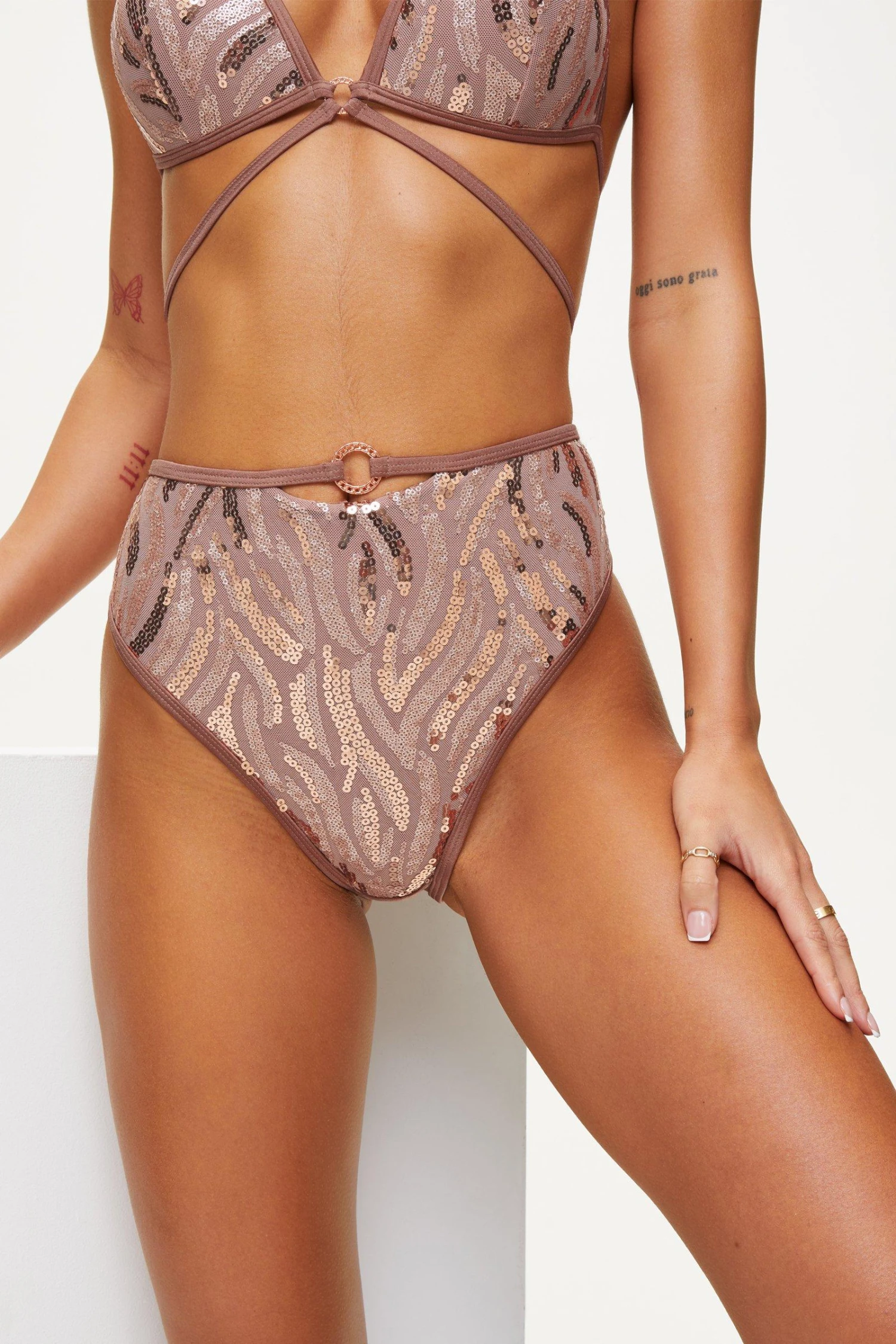 Turn heads in our Gold Coast High Waisted Bikini. Made from dazzling multi-tonal zebra sequinned fabric, it is cut to a High Waisted shape with Bikini Bum Coverage. Finished with a key hole and hardware detail at the centre front and tie up side straps for a comfortable fit. Pair yours with the matching Gold Coast collection for a chic poolside look.