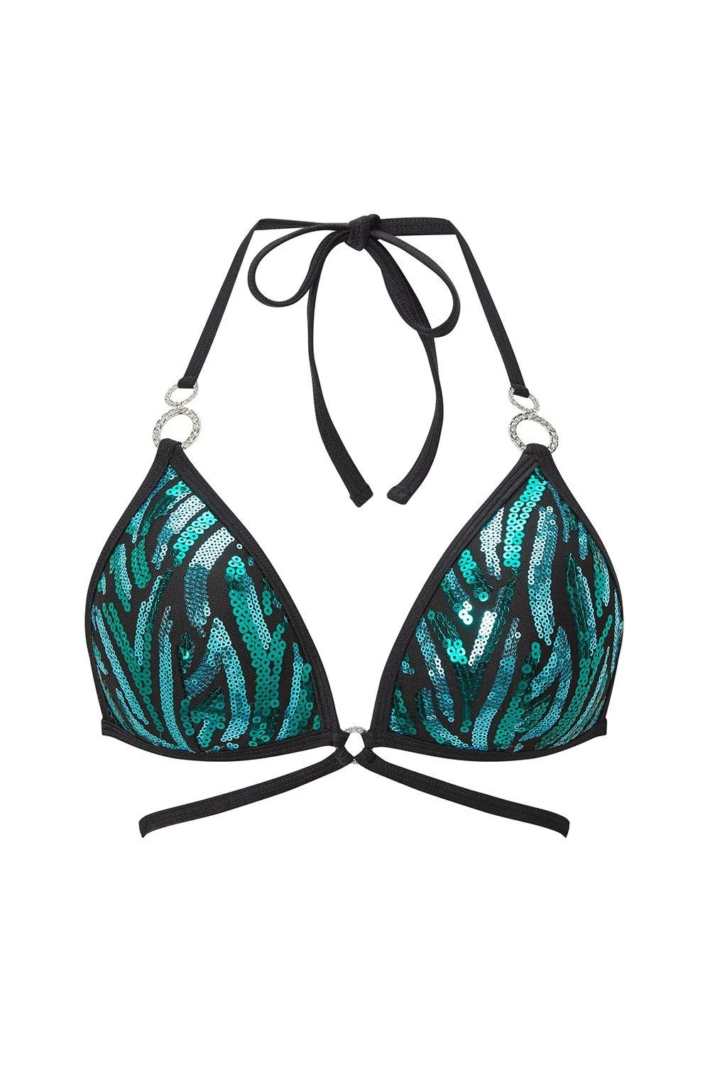Turn heads in our Gold Coast Bikini Top. Made from dazzling multi-tonal zebra sequinned fabric, it is halter neck with graduated padded pre-formed cups for added uplift. Cut to a plunge shape, it features eye-catching hardware at the apex and centre front and dual underbust tie strapping. Pair yours with the matching Gold Coast collection for a chic poolside look.