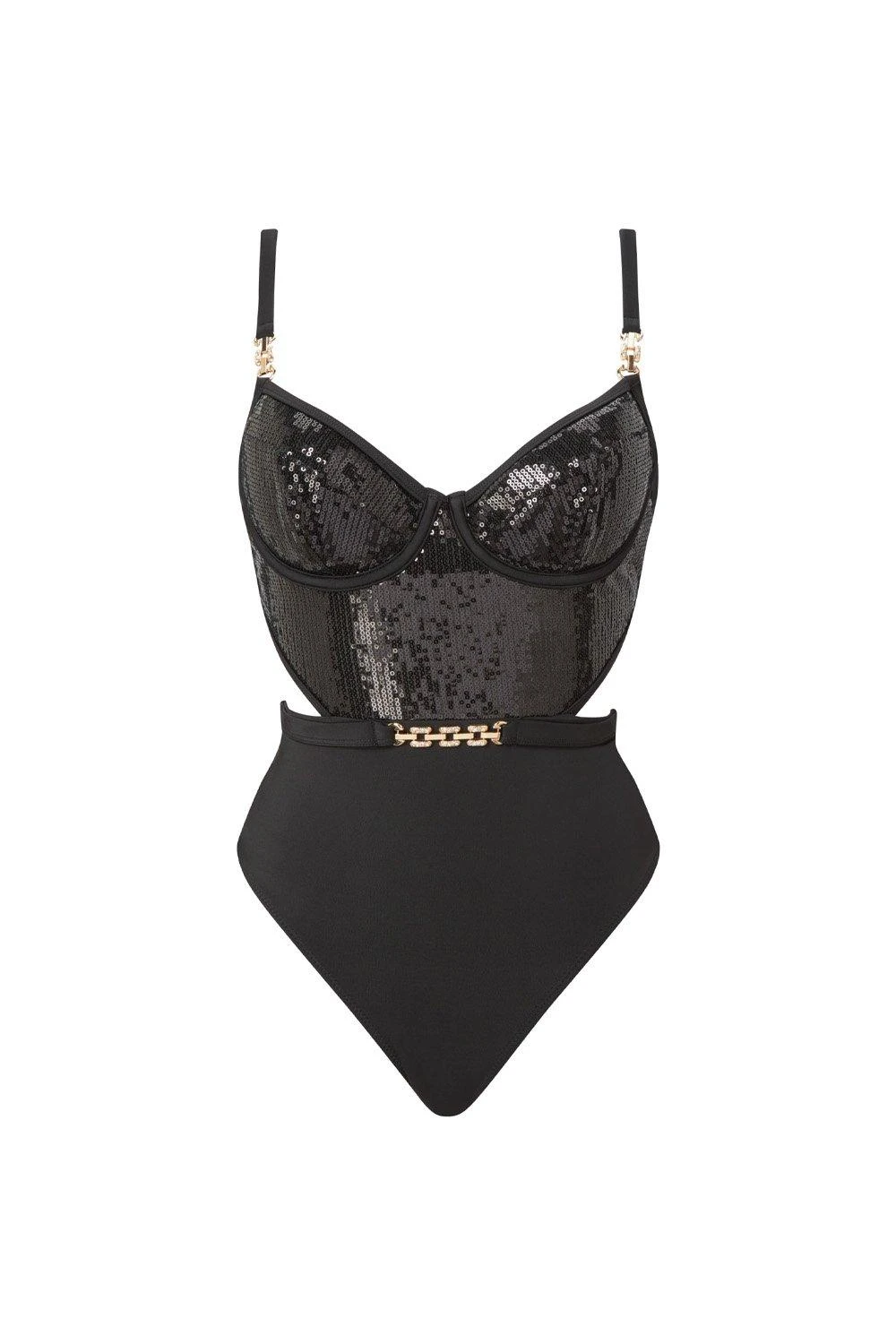 Slip into our Hold Me Tight Swimsuit to spend your time lounging by the pool. The cups feature removable padding and are underwired to accentuate the bust, whilst the sequinned fabric at the top gives a glamorous look. Eye-catching hardware detail adorns the apex and the waistband whilst the cut out detail on the sides and back give a subtle peek. The back is complete with a butterfly clasp and Bikini Bum Coverage. Wear yours to make an entrance at the next pool party.