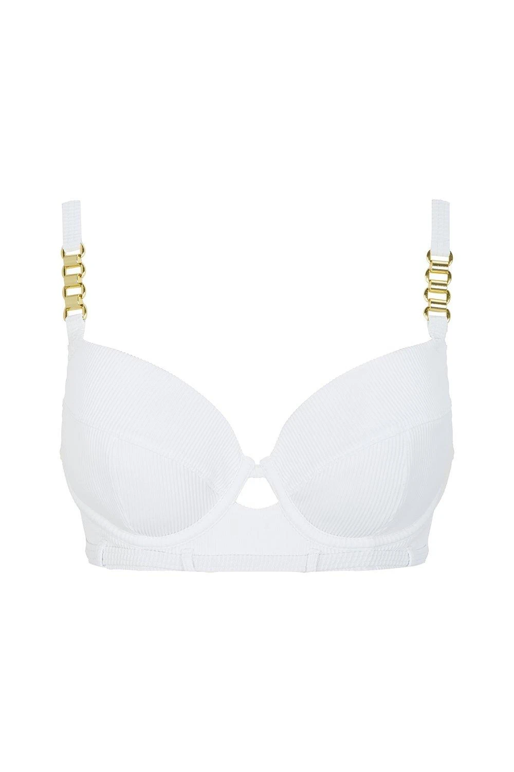 This summer is going to sizzle with the Riviera bikini bra top. Finished in recycled ribbed fabric, this beautifully flattering design will ensure you feel supported and sexy. Complete with a cheeky cut out to the front and a sprinkling of gold detailing for the ultimate beach day look. Don’t forget the matching Riviera bottoms when adding to basket…