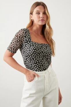 Cami or blouse? Shirt or bodysuit? Whatever you’re after, our women’s tops have you covered for every event in the social calendar. From casual fits to elevated styles for special occasions, we make it easy to nail the ‘jeans and a nice top’ look. Think puff sleeves, pretty prints, wrap silhouettes and so much more.Style: Daisy Square Neck Fitted Mesh Top Length: Approx. 64cm Fit: Regular Ideal for: DaywearDesign: Printed Made in the UK Make-up & Fragrance: Primer (Estée Lauder, Futurist Aqua Brilliance Watery Glow Primer), Foundation (Estée Lauder, Futurist Hydra Rescue Moisturizing Foundation SPF45), Bronzer (Benefit Hoola Matte Powder Bronzer), Mascara (Benefit, They’Re Real Lengthening Mascara Jet Black 8.5g), Setting Spray (Urban Decay, All Nighter Setting Spray 118ml), Fragrance (Jimmy Choo Eau De Parfum Signature).