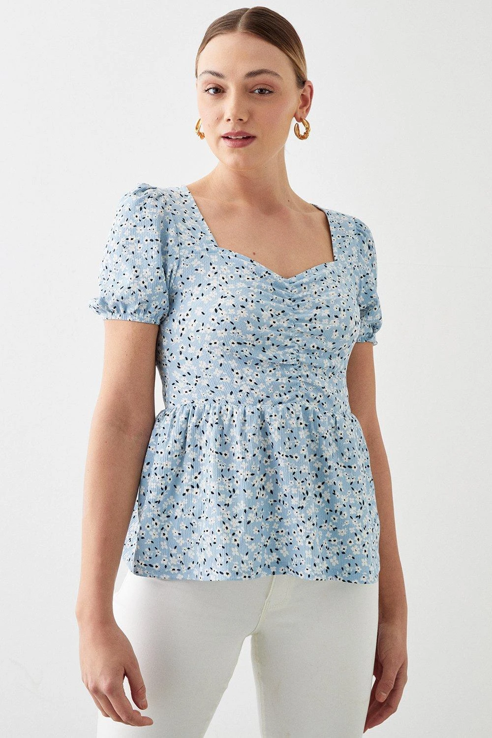 Cami or blouse? Shirt or bodysuit? Whatever you’re after, our women’s tops have you covered for every event in the social calendar. From casual fits to elevated styles for special occasions, we make it easy to nail the ‘jeans and a nice top’ look. Think puff sleeves, pretty prints, wrap silhouettes and so much more. Style: Ditsy Printed Sweetheart Ruched Top. Ideal for: Daywear. Design: Ruched. Model wears size UK 10 and is 5′ 9″ tall. Make-up & Fragrance: Primer (Yves Saint Laurent, Touche Eclat Blur Primer 30ml), Foundation (Estée Lauder, Double Wear Stay in Place Foundation SPF10), Bronzer (Benefit, Hoola Matte Powder Bronzer), Blusher (Benefit, Wanderful World Blushes Starlaa Rosy Bronze Powder Blusher), Setting Spray (Urban Decay, All Nighter Setting Spray 118ml), Fragrance (Ghost The Fragrance Eau De Toilette).