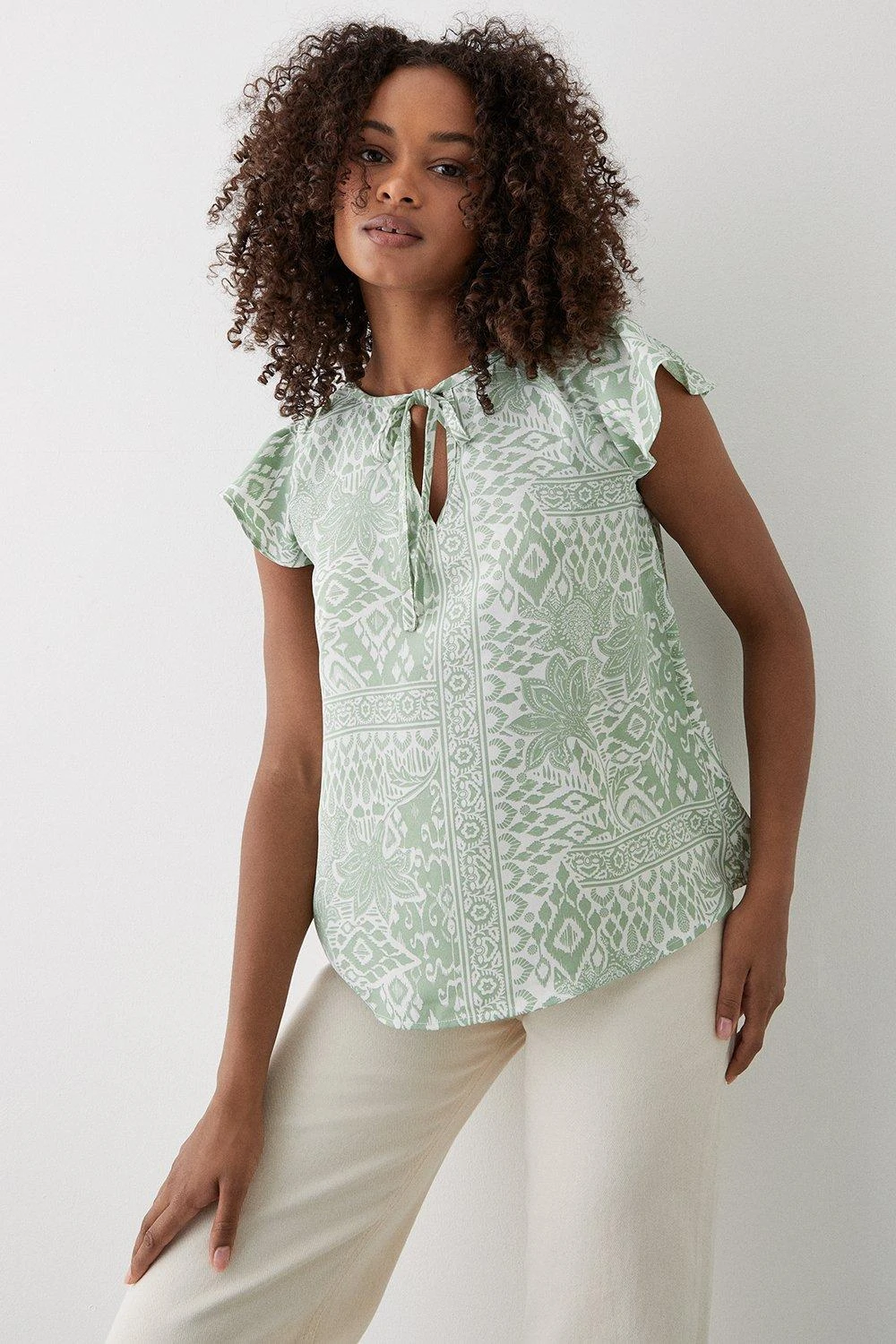 Cami or blouse? Shirt or bodysuit? Whatever you’re after, our women’s tops have you covered for every event in the social calendar. From casual fits to elevated styles for special occasions, we make it easy to nail the ‘jeans and a nice top’ look. Think puff sleeves, pretty prints, wrap silhouettes and so much more. Style: Green Scarf Print Tie Neck Shell Top. Ideal for: Daywear. Fit: Relaxed. Design: Ruffle. Model wears size UK 10 and is 5′ 9″ tall. Make-up & Fragrance: Primer (Yves Saint Laurent, Touche Eclat Blur Primer 30ml), Foundation (Estée Lauder, Double Wear Stay in Place Foundation SPF10), Bronzer (Benefit, Hoola Matte Powder Bronzer), Blusher (Benefit, Wanderful World Blushes Starlaa Rosy Bronze Powder Blusher), Setting Spray (Urban Decay, All Nighter Setting Spray 118ml), Fragrance (Ghost The Fragrance Eau De Toilette).