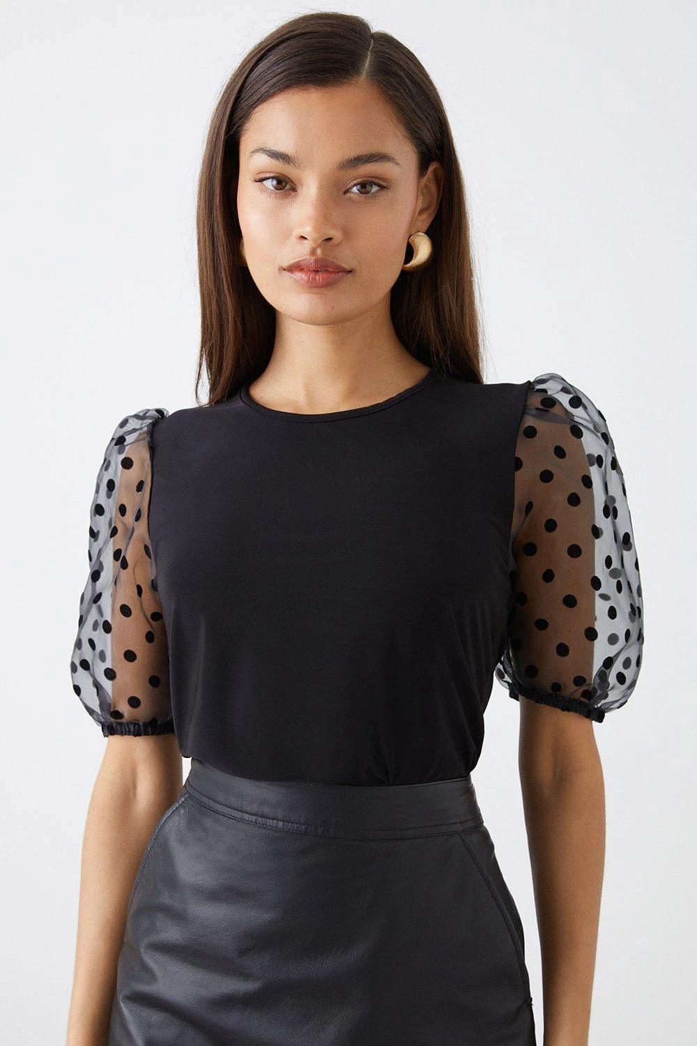 Cami or blouse? Shirt or bodysuit? Whatever you’re after, our women’s tops have you covered for every event in the social calendar. From casual fits to elevated styles for special occasions, we make it easy to nail the ‘jeans and a nice top’ look. Think puff sleeves, pretty prints, wrap silhouettes and so much more. Style: Petite Black Spot Organza Short Sleeve Top. Ideal for: Daywear. Made in the UK. Model wears size UK 10 and is 5′ 3″ tall. Make-up & Fragrance: Primer (Yves Saint Laurent, Touche Eclat Blur Primer 30ml), Foundation (Estée Lauder, Double Wear Stay in Place Foundation SPF10), Bronzer (Benefit, Hoola Matte Powder Bronzer), Blusher (Benefit, Wanderful World Blushes Starlaa Rosy Bronze Powder Blusher), Setting Spray (Urban Decay, All Nighter Setting Spray 118ml), Fragrance (Ghost The Fragrance Eau De Toilette).
