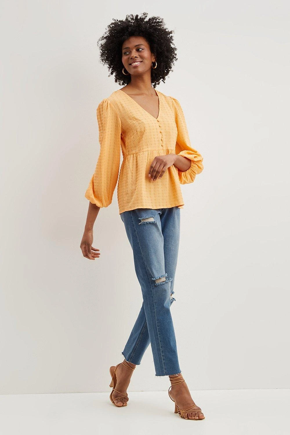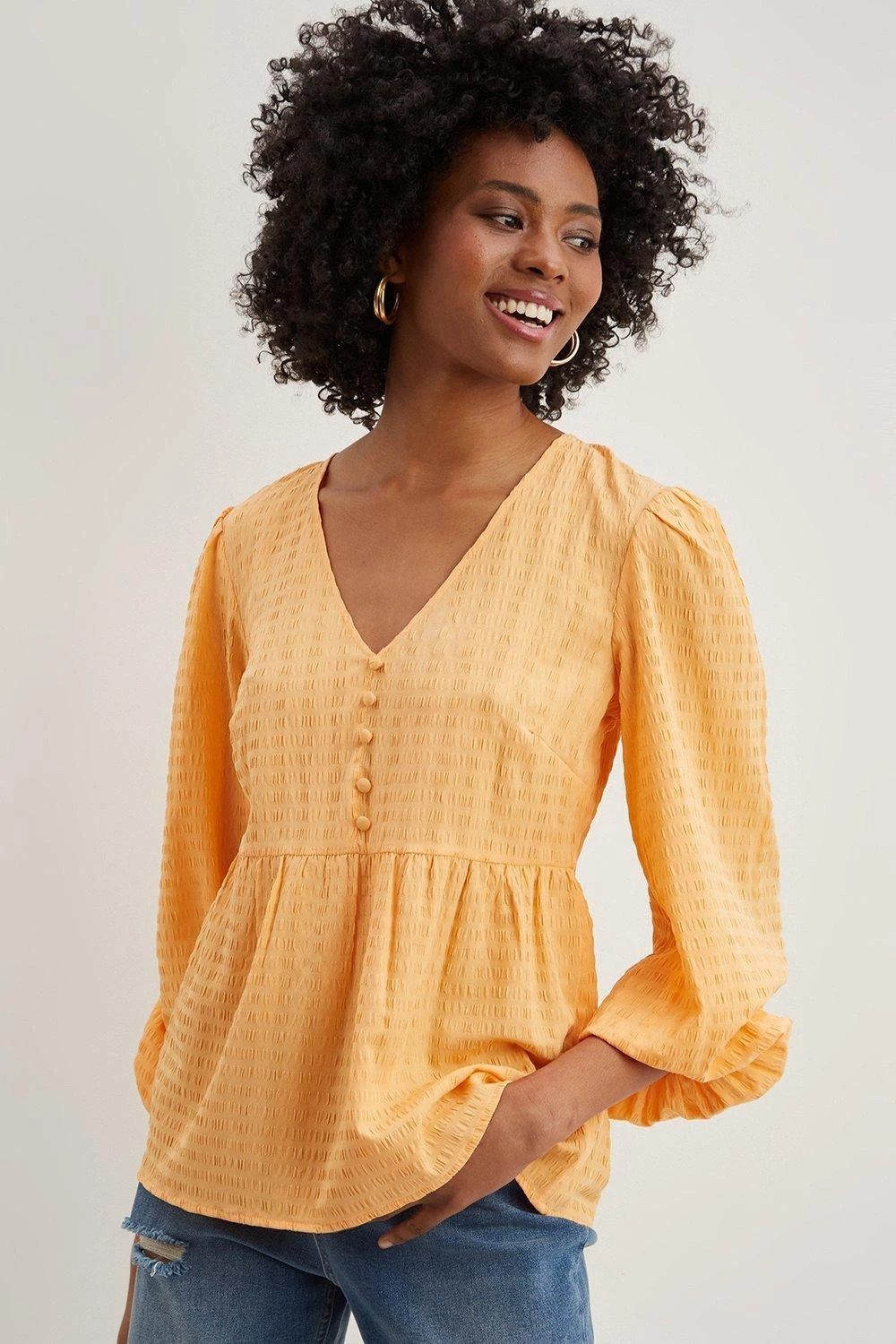 Cami or blouse? Shirt or bodysuit? Whatever you’re after, our women’s tops have you covered for every event in the social calendar. From casual fits to elevated styles for special occasions, we make it easy to nail the �jeans and a nice top’ look. Think puff sleeves, pretty prints, wrap silhouettes and so much more.Style: Tall Orange Textured Button Through TopLength: Approx. 65cmFit: RegularIdeal for: Going OutDesign: Button Through