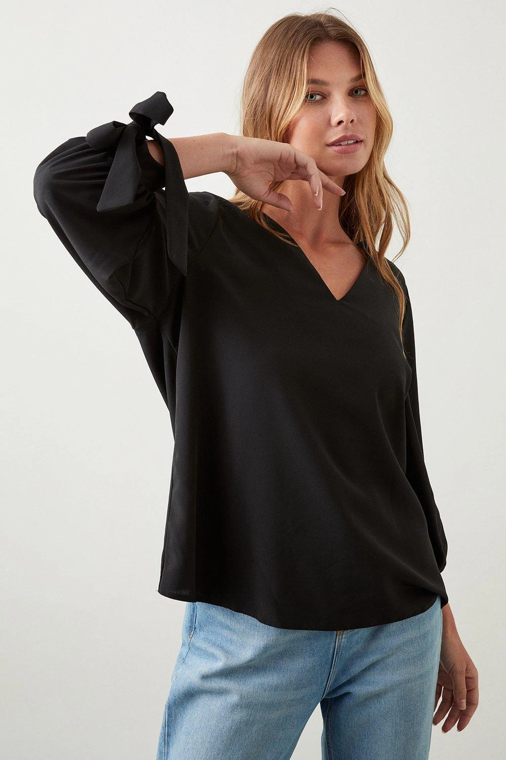 Cami or blouse? Shirt or bodysuit? Whatever you’re after, our women’s tops have you covered for every event in the social calendar. From casual fits to elevated styles for special occasions, we make it easy to nail the ‘jeans and a nice top’ look. Think puff sleeves, pretty prints, wrap silhouettes and so much more. Style: Tie Sleeve V Neck Blouse. Ideal for: Daywear. Fit: Relaxed. Design: Tie. Made in the UK. Model wears size UK 10 and is 5′ 9″ tall. Make-up & Fragrance: Primer (Yves Saint Laurent, Touche Eclat Blur Primer 30ml), Foundation (Estée Lauder, Double Wear Stay in Place Foundation SPF10), Bronzer (Benefit, Hoola Matte Powder Bronzer), Blusher (Benefit, Wanderful World Blushes Starlaa Rosy Bronze Powder Blusher), Setting Spray (Urban Decay, All Nighter Setting Spray 118ml), Fragrance (Ghost The Fragrance Eau De Toilette).This garment is READY FOR THE FUTURE.Recycled fibres can be used for a number of materials including polyester, cotton and acrylic. They are a more sustainable alternative, as they take less energy, land and water to make than virgin fibres, and are often derived from products that would otherwise have gone to wasteFind out more about our sustainability guidelines and goals.