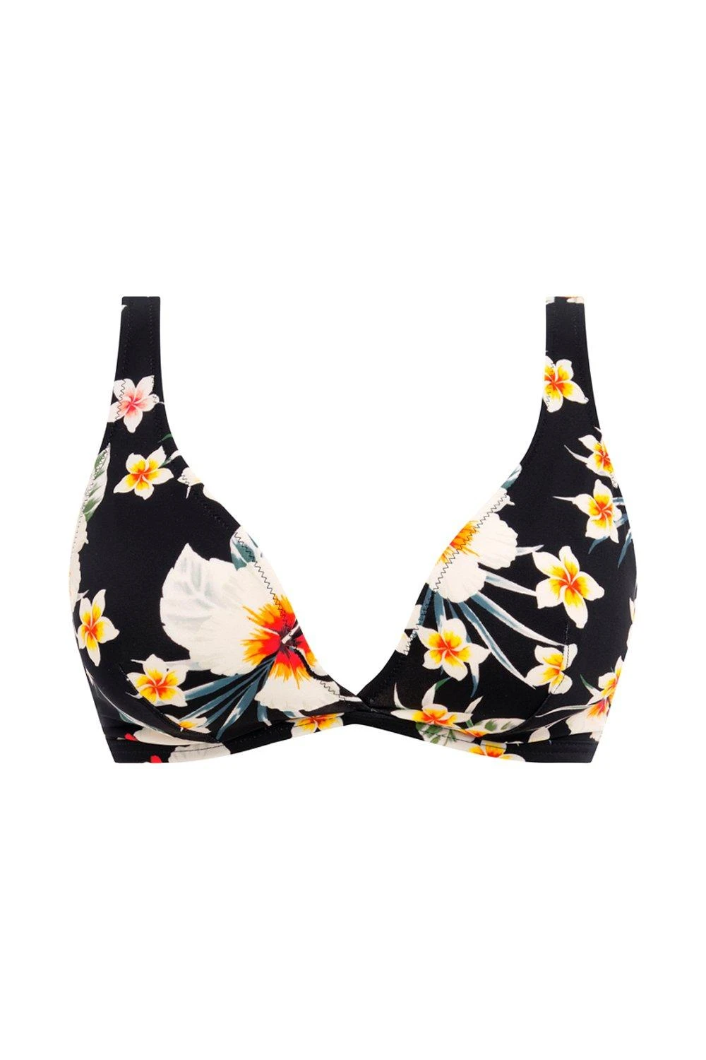 Inspired by those long tropical nights, Havana Sunrise presents a Cuban floral and palm print design with a colour palette drenched in sunset hues and leafy green accents. The Non Wired Triangle Bikini Top features a sexy low plunging neckline with elongated apex. Powernet lined cups for shaping and support. Split underband and clasp sizes, to offer more support to larger sizes. Made from 83% Nylon/Polyamide – 17% Elastane.